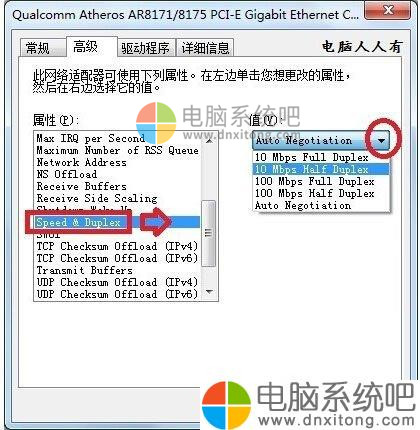 4、也可以尝试设置成10M网络加大网络容错率。Speed&Duplex▶点击右边的下拉菜单箭头▼并选择▶10Mbps Half Duplex ▶确定。