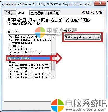 3、把网卡属性(设备不同,菜单各异)▶Speed&Duplex ▶Auto Negotiation 设置一下。
