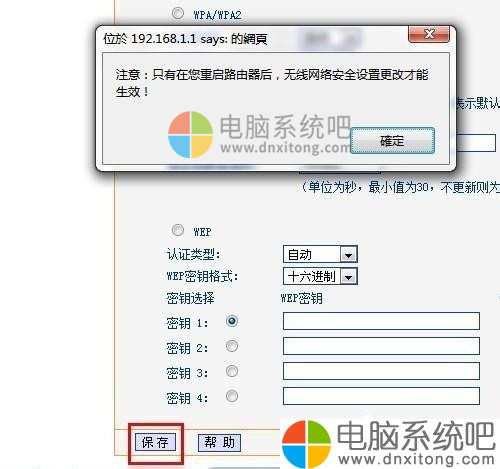 6、密码设置好后点击保存,这个时候电脑系统会提示要重启路由器,点击确定!等电脑系统自动重启之后新密码也就生效了!