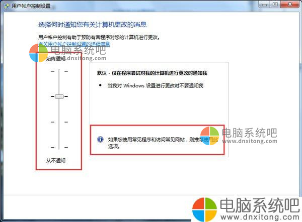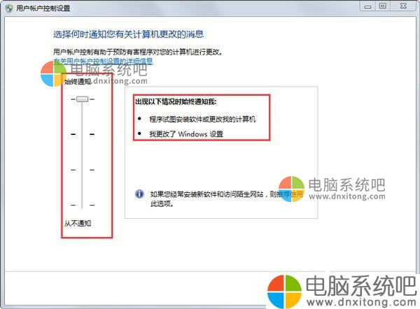 查看“用户账户控制”,会发现左侧的滑块处于顶部“始终通知”,看右边的说明,也就是说这个设置无论是安装软件还是对电脑中的文件进行操作时,都会进行通知。把滑块下拉,根据需要选择合适的设置即可。