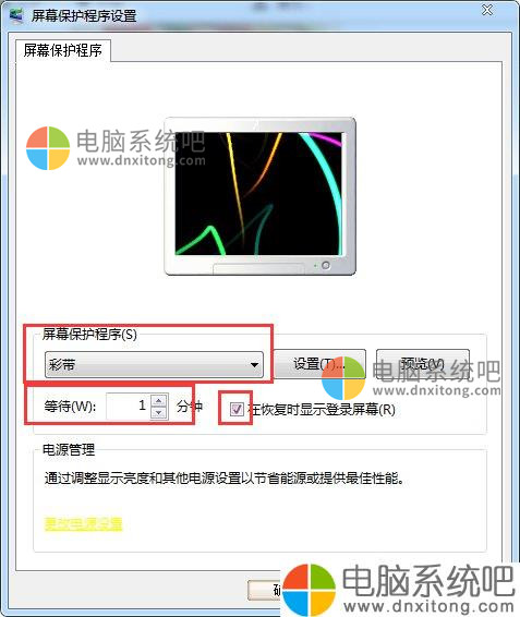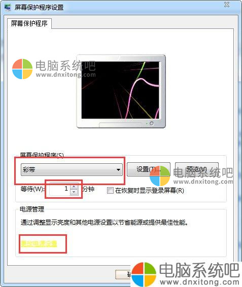 2、在打开的“屏幕保护程序设置”窗口中,选择一种屏幕保护程序,如“彩带”, 同时设置“屏幕等待时间”,如1分钟,勾选 “在恢复时显示登陆屏幕”。最后点击“确定”完成设置。
