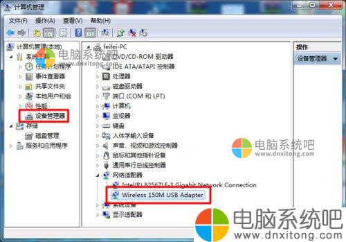10.在打开的“计算机管理”窗口中,点击“设备管理器”项,就可以查看到已成功安装的无线网卡设备。此时表明USB无线网卡驱动正确安装。