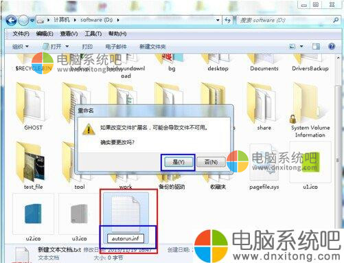 4、将新建的文件的名称修改为autorun,并将其扩展名txt修改为inf,修改的时候会弹出如下图的提示框,请直接点击“是”。