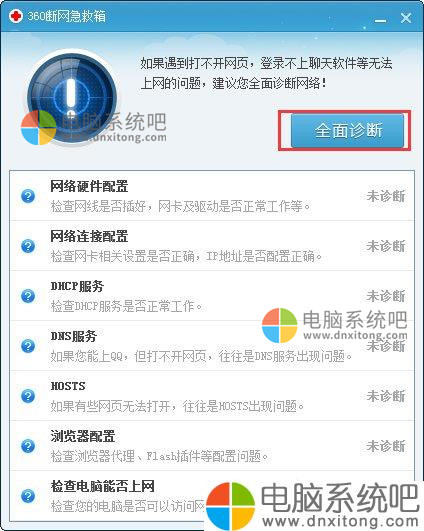 2.打开断网急救箱之后,点击【全面诊断】按钮,对你的网络进行诊断。