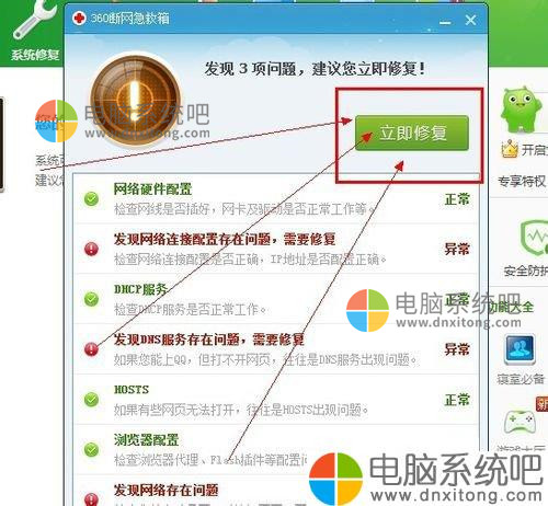 3.诊断结果显示你的DNS出现错误,还有一些其他的情况,点击【立即修复】按钮,对你的网络进行修复。