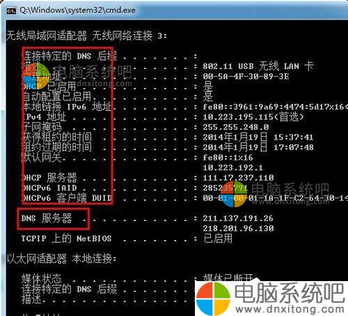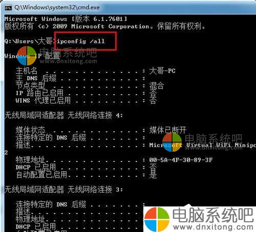 2.在开始中输入cmd,打开之后再里面输入ipconfig /all就可以查看你的所有的ip信息,包括DNS信息。