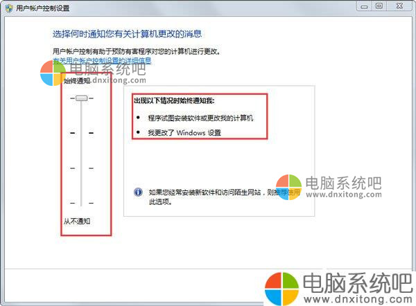 1.点击开始——控制面板——用户账户和家庭安全——用户账户——更改用户账户控制设置,查看“用户账户控制”,会发现左侧的滑块处于顶部“始终通知”,看右边的说明,也就是说这个设置无论是安装软件还是对电脑中的文件进行操作时,都会进行通知。把滑块下拉,根据需要选择合适的设置即可。