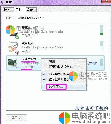 4.对混音选项进行调试,点击“立体声混音”,右键“属性”,或者是右下角的。
