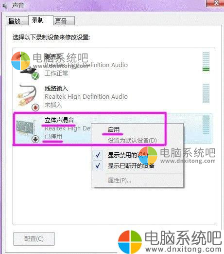 3.看到“立体声混音”选项,在上面右键,选择“启用”。