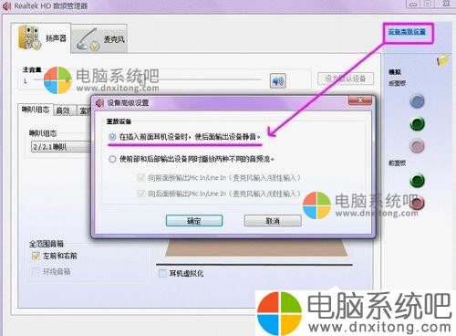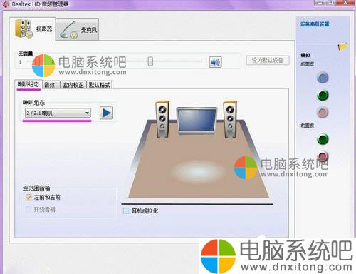6.音频管理器设置,双击打开右下角的“红色小喇叭”;或者是:开始-设置-控制面板-高清声卡。扬声器“喇叭组态”设置。