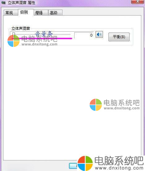 5.出现“立体声混音”音量条,根据实际效果自行调节,点右下角的“确定”。再点到播放上,在扬声器上右键属性,点击级别,把里面的所有小红叉点消掉。