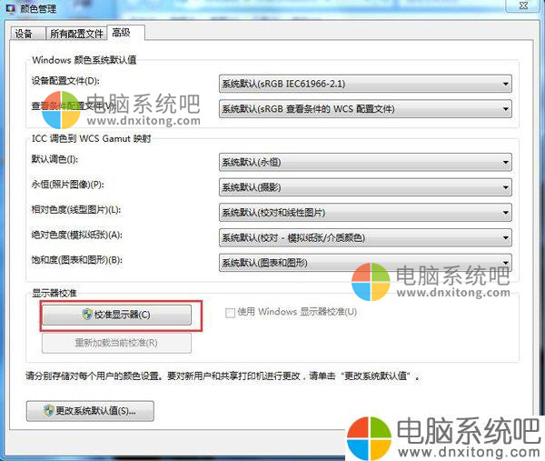 3、在颜色管理页面高级标签面下面,有一个显示器校准的功能栏,其中有一个校准显示器的功能按钮,点击一下这个按钮开始校正显示器。