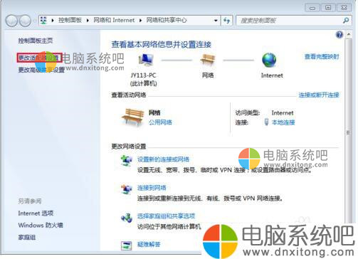 2、在网络和共享中心界面中点击“更改适配器设置”。