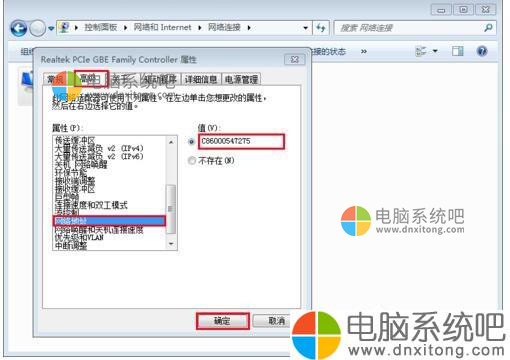 6、切换到“高级”选项卡,在属性列表中找到并点击“网络地址”,在右侧输入修改后的网络地址,点击确定按钮。