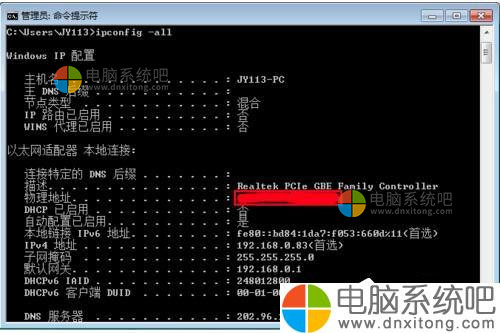7、使用命令提示符,输入Ipconfig -all,可以查看修改后的物理地址。