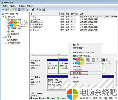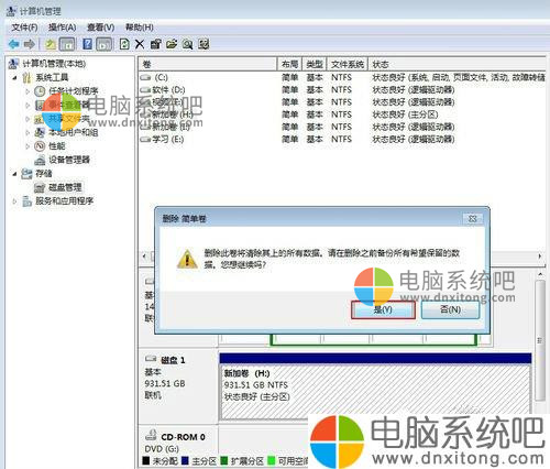 4.右键单机移动硬盘分区-》删除卷-》电脑系统提示所有数据都会丢失,如果没有数据需要备份或者数据已经备份了,请直接点“是”。删除卷后,会显示“未分配”。