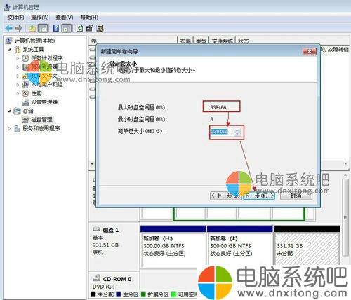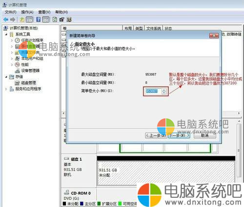 5.在“未分配”上点击右键-》新建简单卷-》下一步-》然后会出现磁盘大小信息,这时候要注意了,整个移动硬盘只要一个分区的话,什么都不用改,直接点击下一步。如果要做成多个分区的话,这里要填写第一个分区的大小。这里按硬盘大小平均分成三个分区,所以改成了307200-》然后点击下一步。
