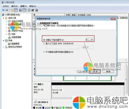 6.“分配以下驱动器号”,可以不改,也可以根据喜好进行修改,如果驱动器号已经被占用,则要选择未被占用的驱动器号。然后点击“下一步”。