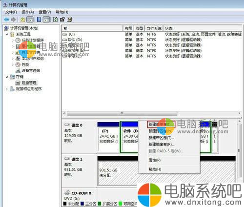 9.在剩下的“未分配”磁盘上右键-》新建简单卷,然后重复上面的步骤,去建立第二个分区。