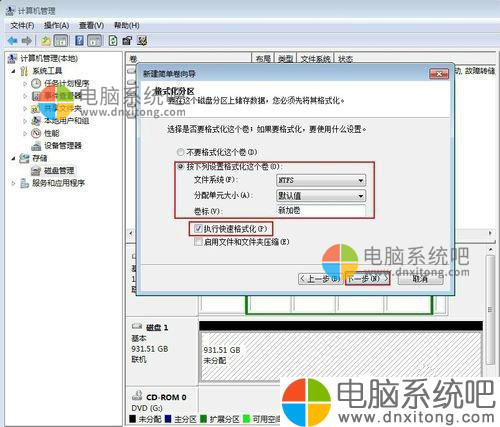7.这一步可以设置“文件电脑系统”的格式,一般默认“NTFS”就可以了。卷标也可以根据喜好修改。勾上“执行快速格式化”,然后点击“下一步”。