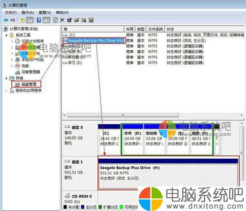 3.点击“磁盘管理”,然后你就会看到移动硬盘的信息,移动硬盘默认只有一个分区。