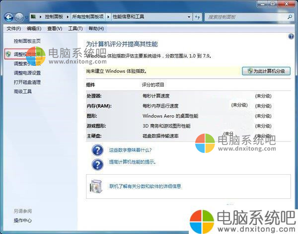 3、然后在“性能信息和工具”窗口中点击左边的“调整视觉效果”。