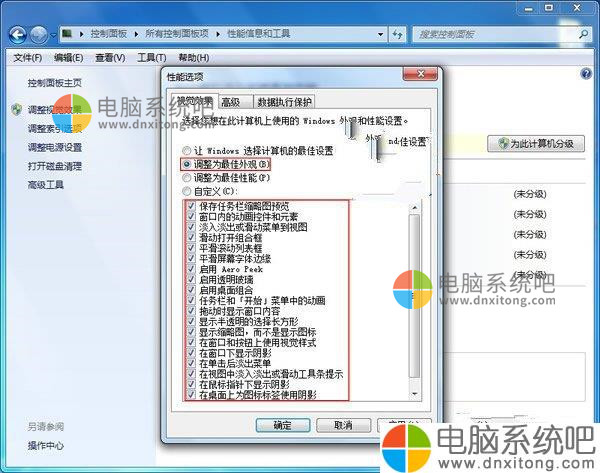 4、此时弹出“性能选项”在“视觉效果”中电脑系统默认是“调整为最佳外观”。