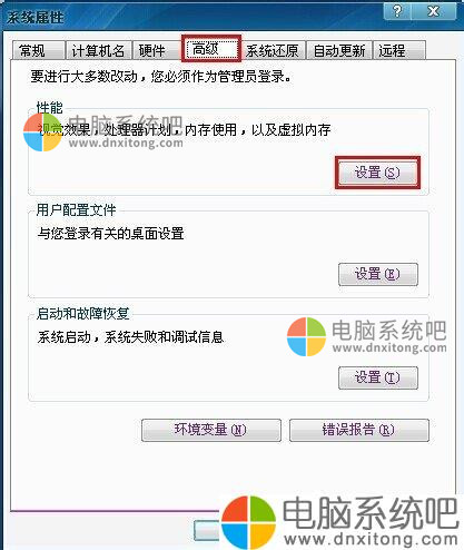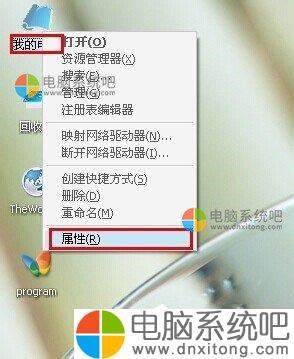 2、找到我的电脑图标,右键单击选择“属性”,在弹出电脑系统属性中,选择“高级”,找到性能这一块,点击后面的“设置”按键。