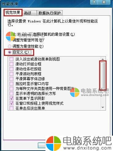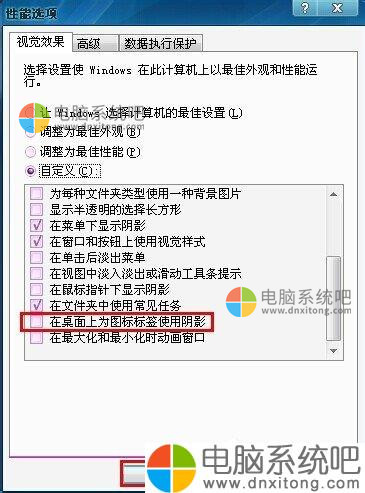 3、来到性能选项面板,看“视觉效果”一栏,下面有一个是“自定义”选择,然后滑动右边的进度条,后面有一个“在桌面上为图标标签使用阴影”。