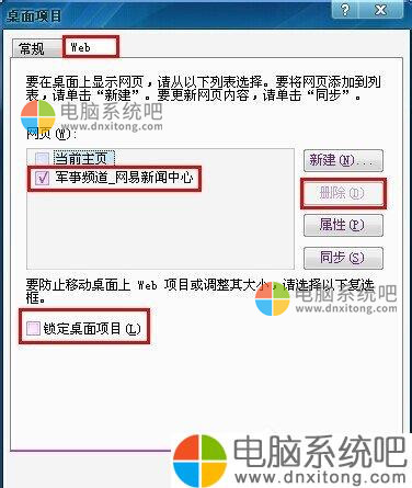6、单击右下方的”自定义桌面“,弹出”桌面项目“面板,选择第二个”web“将网页里面的链接网页以及下面的”锁定桌面项目“前面的勾勾都去掉,确认就可以了。