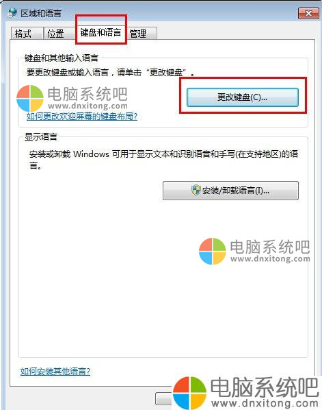 1、在“控制面板”里面选区域与语言选项——更改键盘或其他输入法,点击进入,如下图所示: