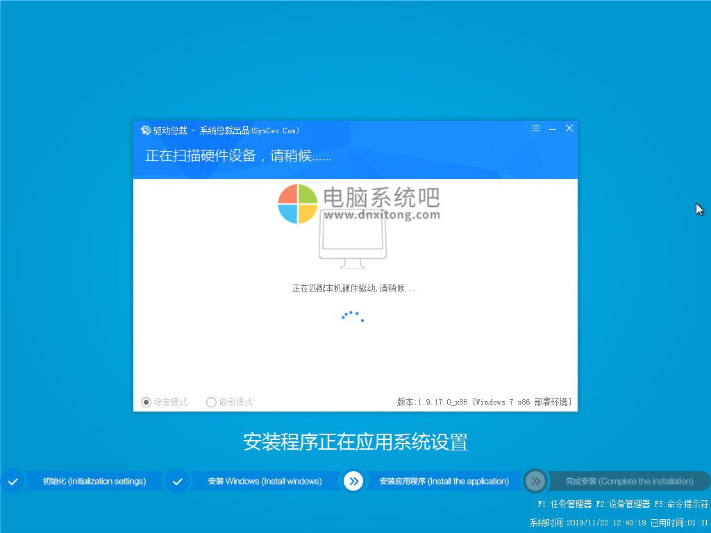 特别说明:如果是优盘PE安装系统,安装结束后选择重启,重启出现启动画面后一定要拔掉U盘,不然会出现盘符错乱。