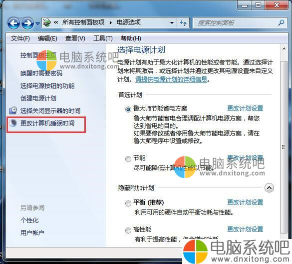 3、在电源选项窗口中点“更改计算机睡眠时间”打开对应的设置页面。