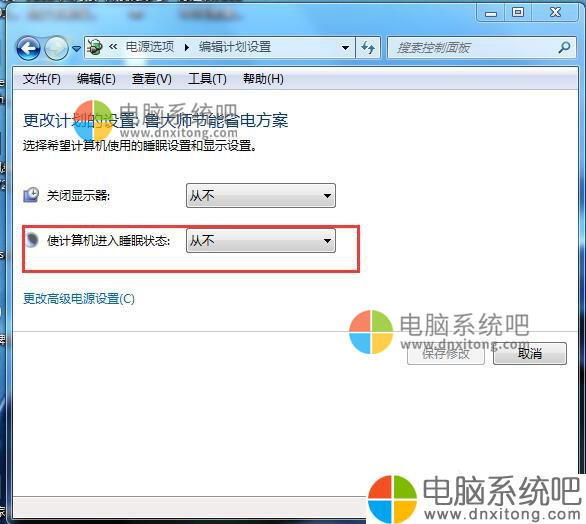 4、在“使计算机进入睡眠状态”一栏两个设置中,选择“从不”,然后点“保存修改”按钮保存设置。