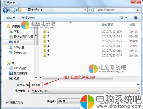 3、另存为任意文件名.bat文件,比如关闭休眠.bat和开启休眠.bat,下图以aa.bat为例。
