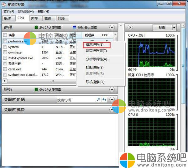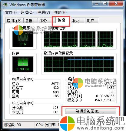 3、性能里面,我们可以监视CPU的使用率。打开资源监视器。然后将一直占用CPU比较高的进程关闭,查看到底是哪个进程或者程序使用CPU资源。