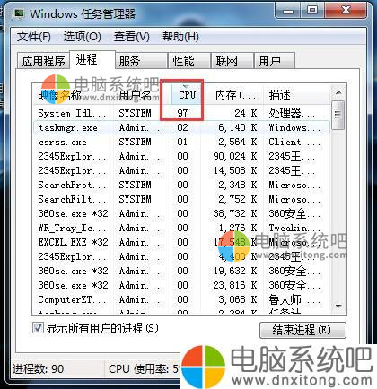 2、任务管理器界面,点击进程打开,然后我们选择占用CPU非常高的进程,然后关闭进程,这样可以降低CPU的使用率,这里每个进程都有具体的介绍,将一些自己确定不使用但是还非常占用CPU进程关闭,这里一些电脑系统进程不要关闭比如,SVCHOST.EXE进程。
