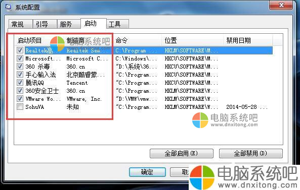 5、启动里面,我们将开机不自动运行的程序前面对勾取消,这样可以避免很多程序开机自动运行,从而开机以后,就自动在我们电脑后台运行,占用CPU。