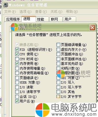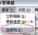 3)打开任务管理器,点击“查看“菜单,选择“选择列”,给进程列表中添加”PID“列,然后找到PID对应的进程就可以了。
