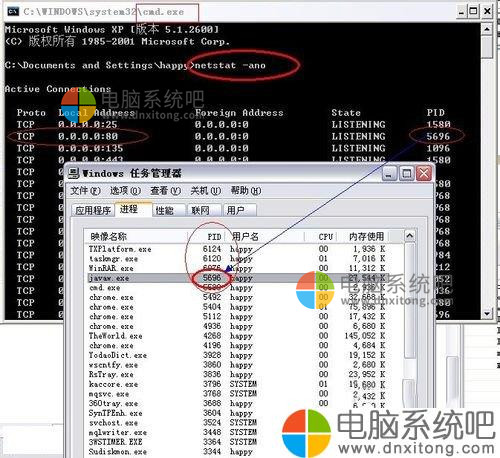 要想知道某个端口被哪个应用程序占用了,有两种方法: