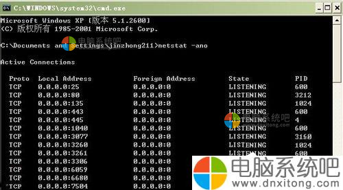 2)在命令行中输入netstat -ano,得到端口号对应的PID