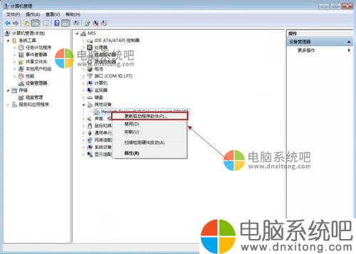 2.在设备管理器中找到【其他设备】选择你所插到电脑里的设备名称,点在上面点击右键选择【更新驱动程序】。