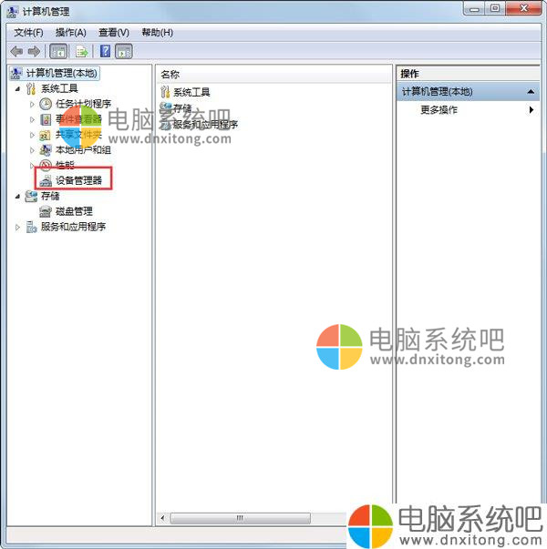 1.在桌面上点击【计算机】右键,选择【管理】,再选择【设备管理器】。