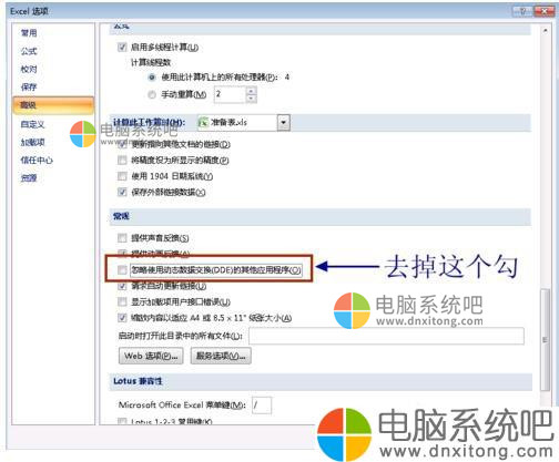 4、去掉“忽略使用动态数据交换DDE的其它应用程序”前面的勾。确定即可。