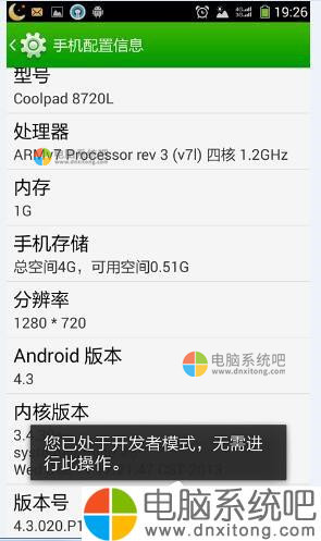 第四步:在【手机配置信息】界面找打【版本号】,连续点击版本号五次,直到提示(您已处于开发者模式,无需进行此操作)为止