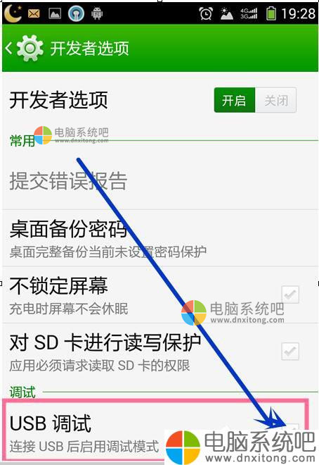 第六步:在【开发者选项】界面,找到【USB调试】把后面的框打对勾。如图所示!设置完之后,手机就可以重新连接到电脑上了哦!