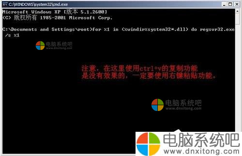 【小技巧】如果怕输入错误的话,可以复制这条指令,然后在命令提示框点击左上角的c:,使用下面的“编辑-粘贴”功能就不容易输错了。在飞速滚屏完全静止之后,别着急启动其他程序,先耐心等一会儿,因为此时dll们还在找位置。直到你的指示灯不闪了再做别的。