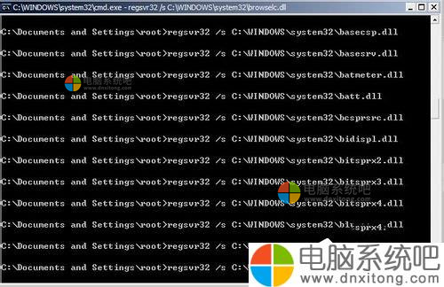 2、在命令行中输入: for %1 in (%windir%system32*.dll) do regsvr32.exe /s %1 ,在这里我们可以先将此命令复制,然后利用cmd命令编辑的粘贴到命令行中,然后点击回车,这时候需要等一段时间。如下图所示: