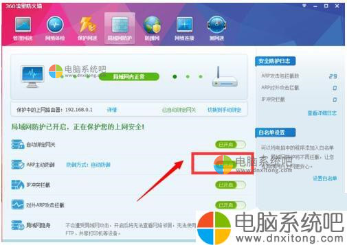 2、从打开的“360流量防火墙”界面中,切换到“局域网防护”选项卡,开启“ARP主动防御”,以阻止局域网ARP攻击的发生。从而确保网速的正常畅通。