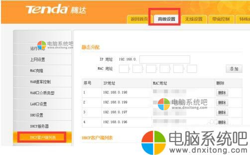 3、接下来我们需要限制或合理分配局域网电脑网速。登陆路由器后台管理界面,切换到“高级设置”-“DHCP客户端列表”选项卡,为自己的电脑设备静态IP地址分配